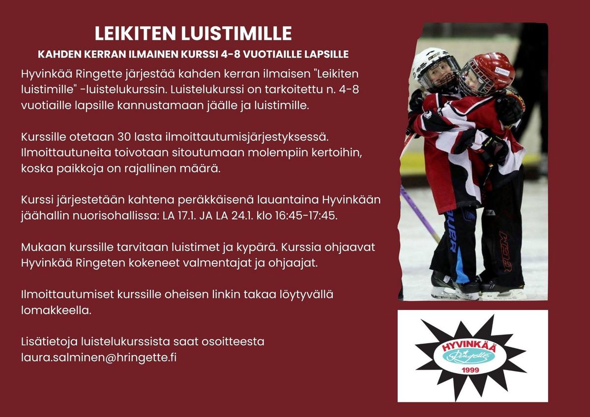 Nyt on hyvä hetki innostaa lapsi mukaan iloisen talviliikunnan pariin. Kurssilta saa rohkeutta jatkaa luistelua ulkojäillä, yleisöluisteluissa tai vaikka ringettekoulussa!